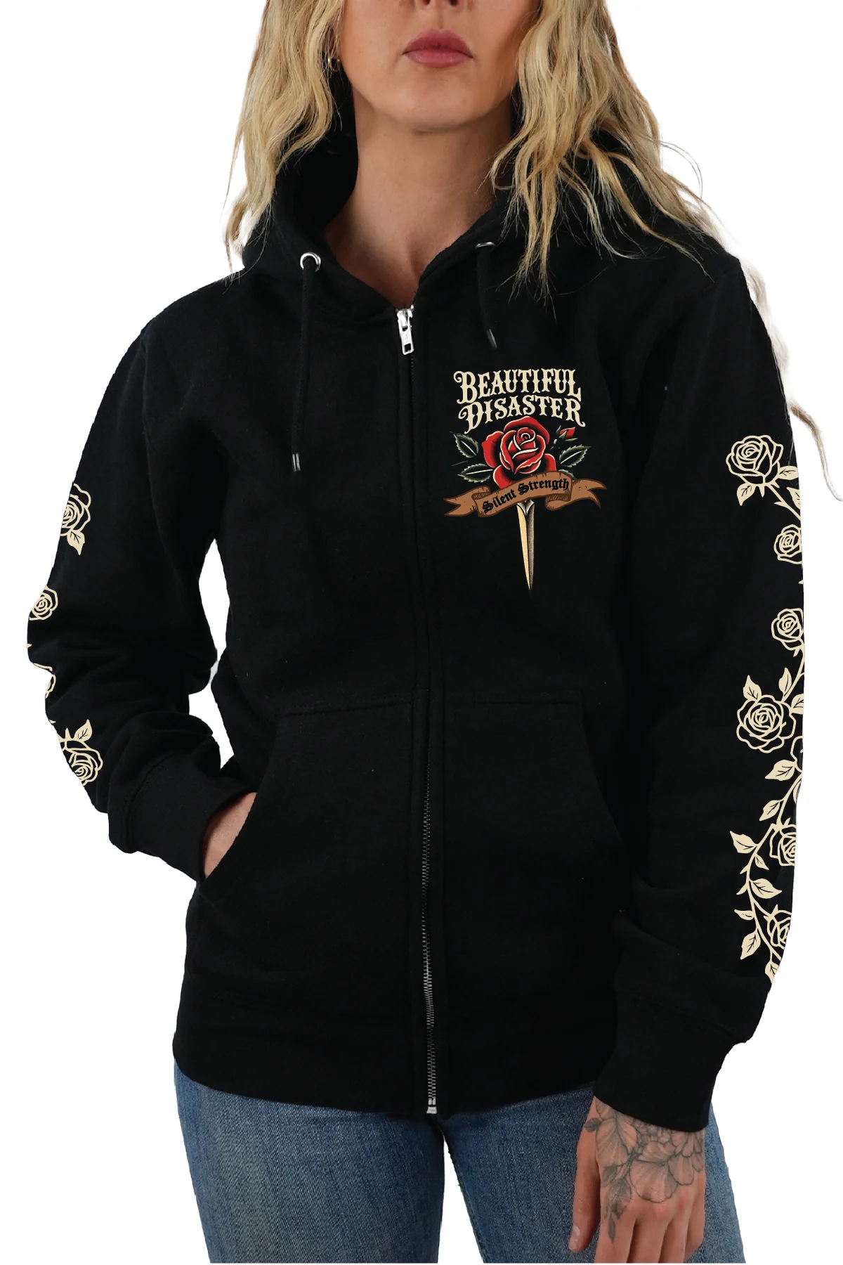 The back design features a striking red rose pierced by a dagger, wrapped in a banner that reads “Silent Strength.” Surrounded by roses down each sleeve, this hoodie is a tribute to resilience, to the strength it takes to keep going when no one is watching, and to the beauty that grows even in darkness.
