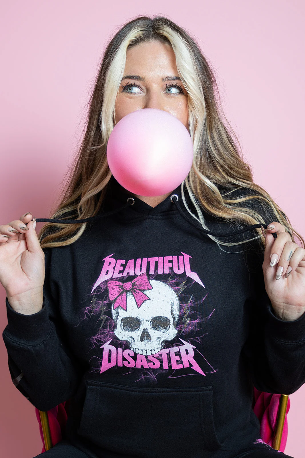Turn the voltage all the way up in the Skull Candy Pullover Hoodie—where sweet meets savage in a sparkly storm of style. This black hoodie features bold pink graphic art front and center, showcasing the signature Skull Candy design: a fierce skull topped with a pink bow and wrapped in smoky, rebellious energy.