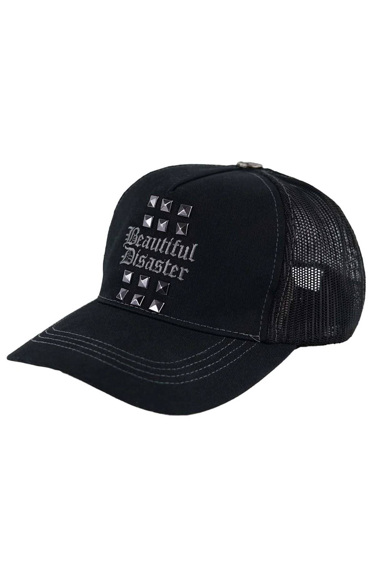 This Classic Snapback Trucker Hat by Beautiful Disaster features our Iconic Original Embroidered Logo with black pyramid stud detail, a breathable mesh rear, slightly curved bill and an adjustable snapback panel. Look under the bill for our repeat logo pattern.